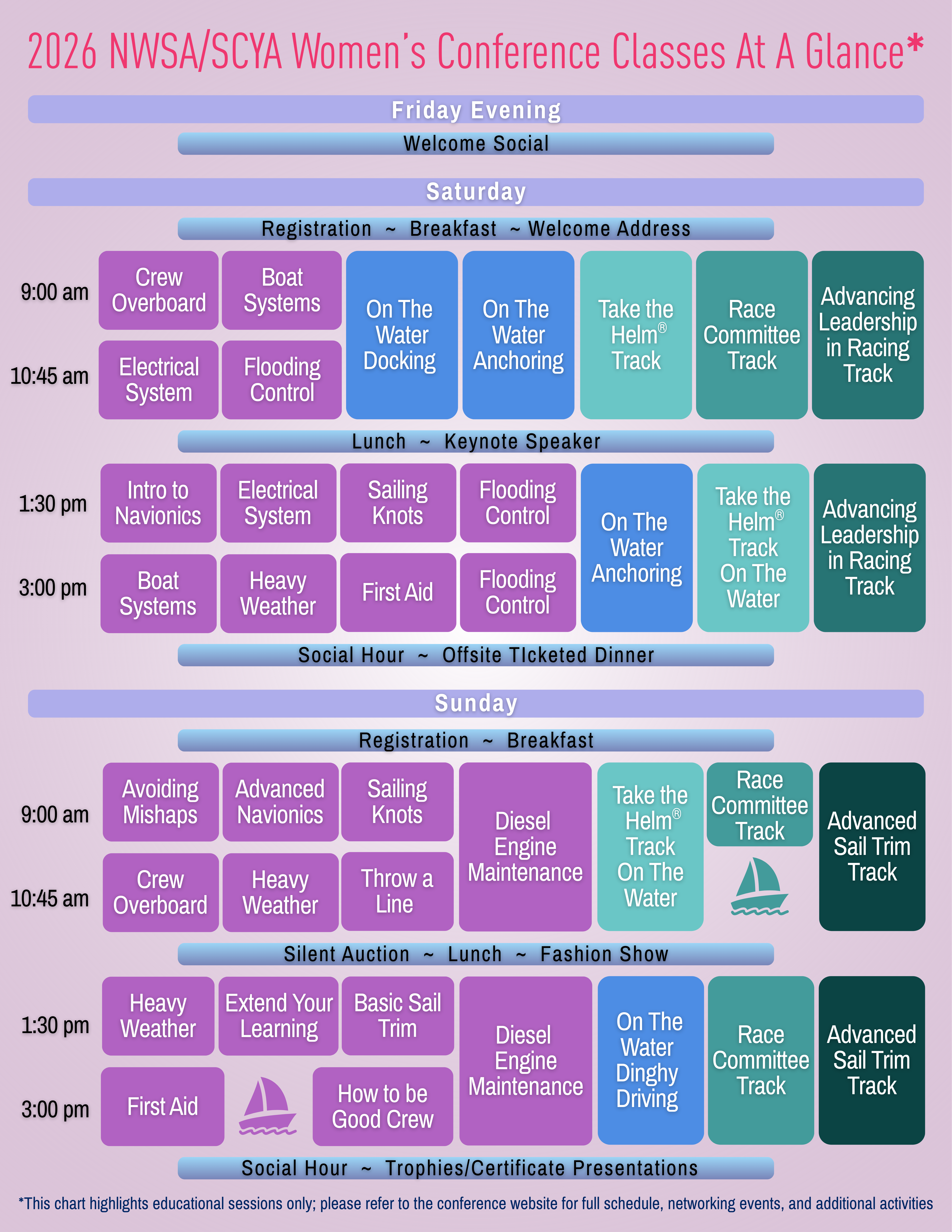 - Two days of classes with 24 topics to choose from, including four new curated tracks with Certificates of Completion: Take the Helm for novices, Advancing Leadership in Racing, Race Committee, and Advanced Sail Trim + mini-regatta!